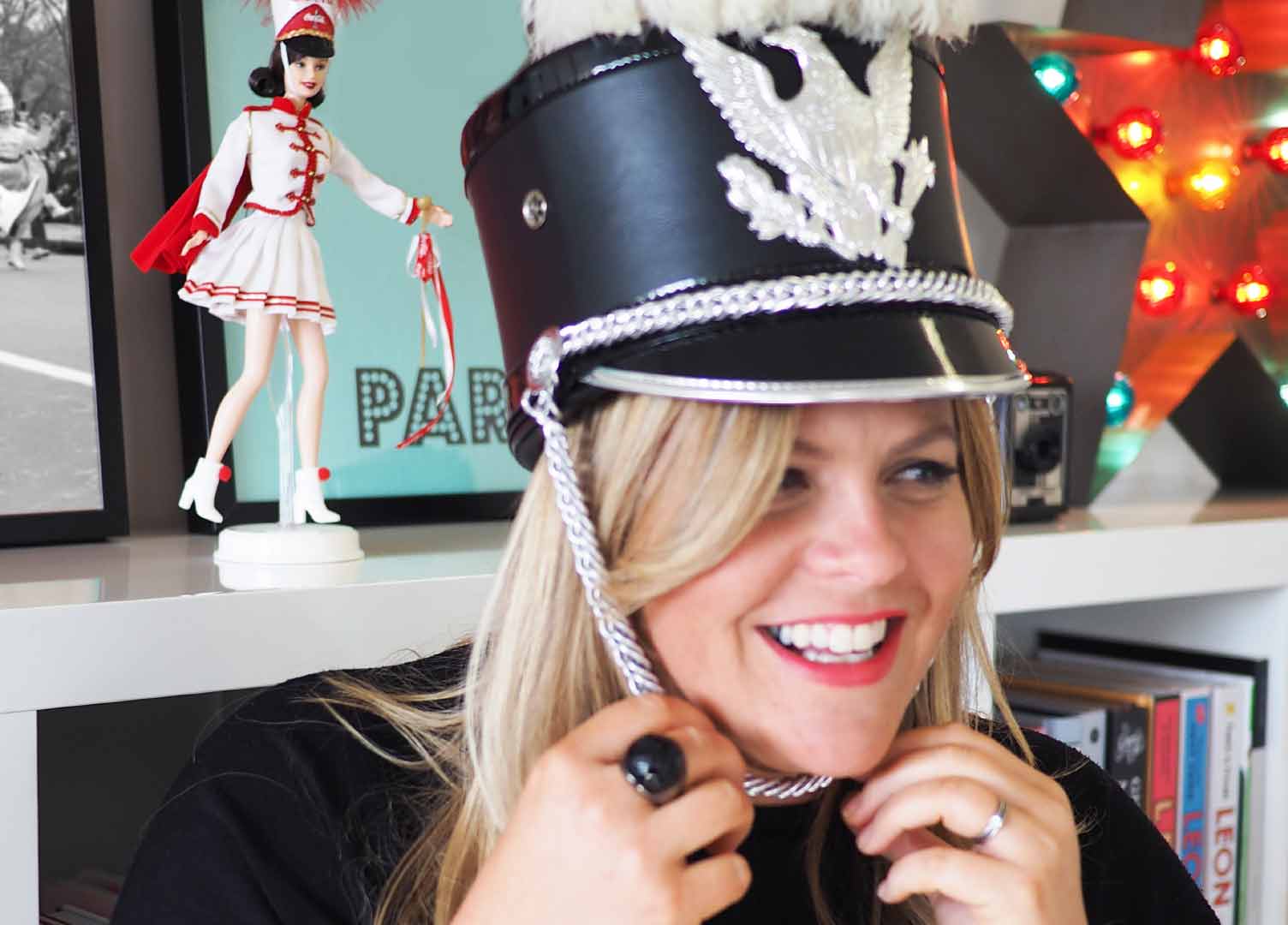 We have a collection of Scout band drums, French horns and cymbals scattered around the studio, but my favourite parade-related item is this original 1930-1945 Los Angeles Police Department marching band ‘Shako’ hat. It came from an antique dealer friend with an official letter of authenticity and both hat and feathered plume were in its original box stamped ‘Handle with Pride’. I love that! It certainly has pride of place in the studio, when not being worn for comedy value.