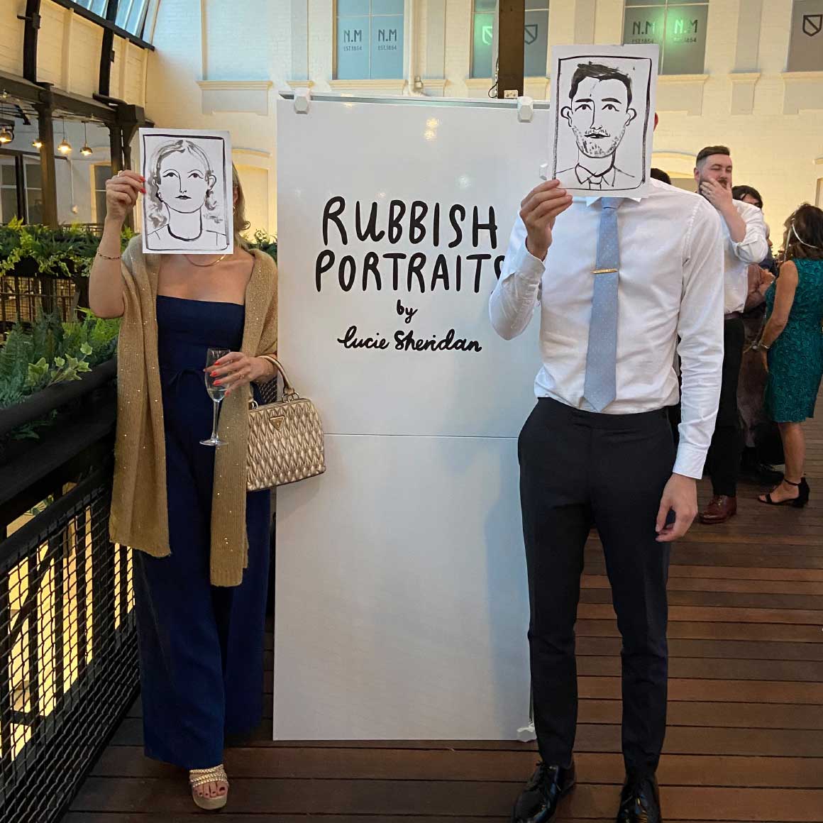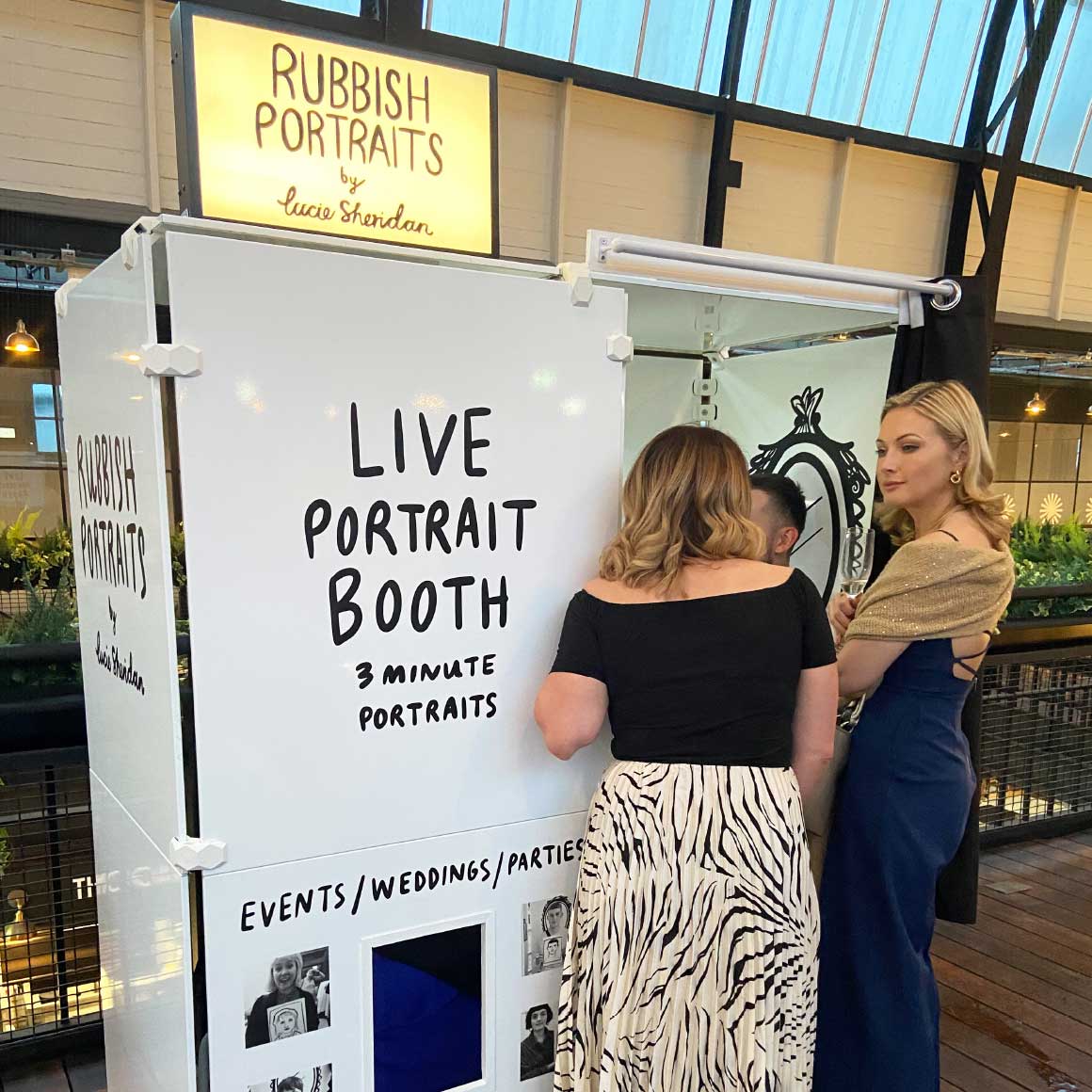 For additional entertainment and a wonderful memento of the day, guests were invited to have a hand painted portrait of themselves by artist Lucie Sheridan in her wonderfully quirky ‘Rubbish Portraits’ booth. Based on the concept of a traditional photobooth, guests enter via a curtain and are seated on a stool. Curtain drawn, you sit towards a window where you will come face-to-face with the hugely talented artist, who immediately puts you at ease whilst putting black ink to paper to create your portrait. We’ve known Lucie for a few years now and sat in her booth on numerous occasions. You just want to sit and talk to her all night! Not too dissimilar to a confession box, you’ll find yourself lost in conversation whilst her artistic magic takes place. After only a few minutes you exit the booth where your completely bespoke, signed Rubbish Portrait is dispensed to you through a slot. You’re even given a branded hard back envelope make sure your work of art doesn’t become crumpled on your journey home. Nice touch. Lucie and her booth travel all over the UK for events, celebrations and festivals. Visit her website and get her booked for your next event. You wont be disappointed.