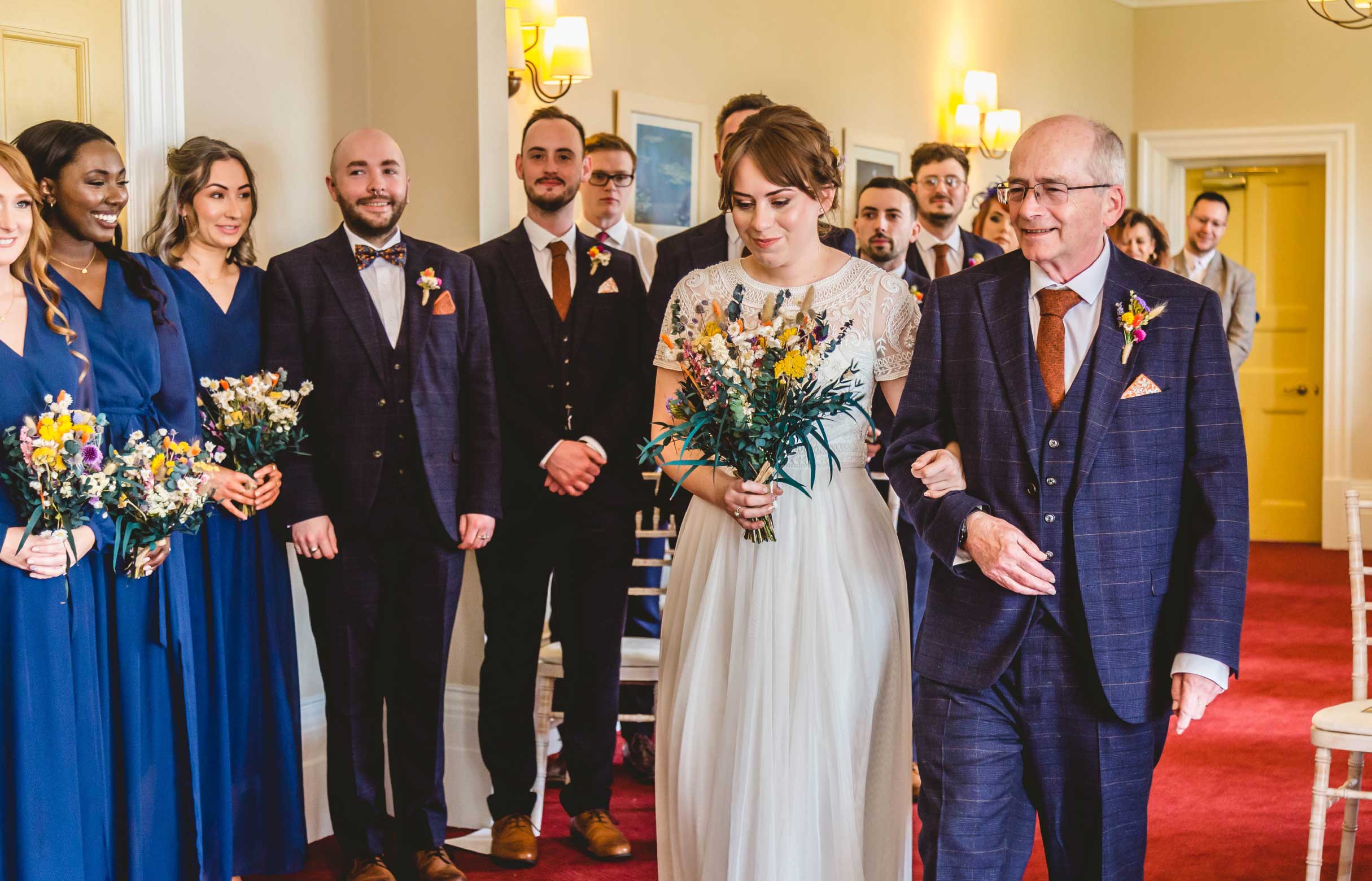 As the glorious sun shone and excited guests arrived, the celebrations began at Newport’s Mansion House as we saw Lauren pull up in a lovely yellow VW Camper van beaming from the window and giving everyone a wave! Gathered inside, we witnessed the emotional moment Lauren’s dad walked her down the aisle to ‘I Always Knew’ a song by The Vaccines, covered by Awfultime. Hankies at the ready as the blubbing commenced seeing Lauren looking soooo beautiful and elegant meeting her handsome husband-to-be. This long awaited day that so much thought and preparation had gone into was finally underway.