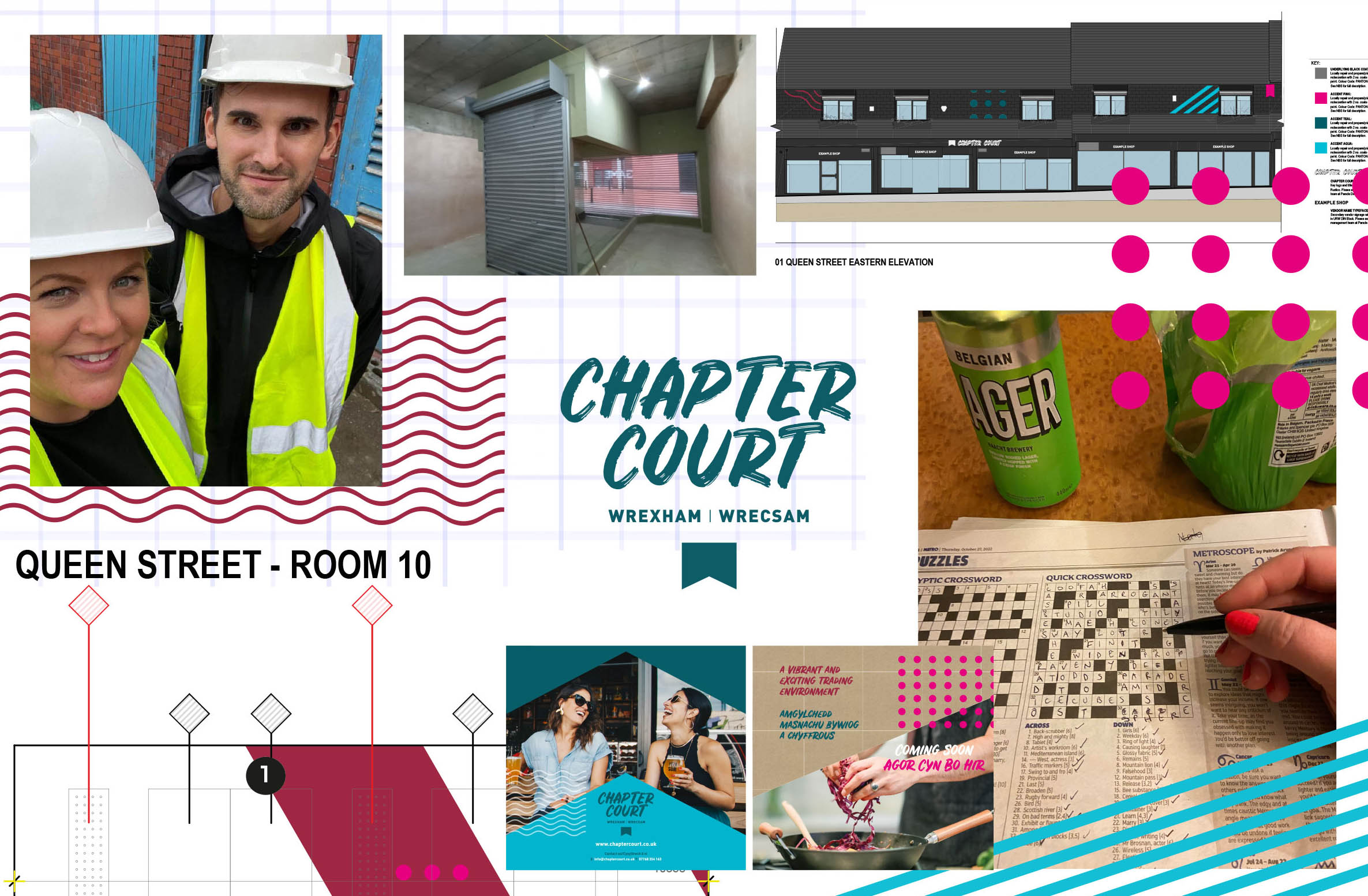 Development is finally underway at Chapter Court, a food court/micro-retailing space in the heart of Wrexham. Having completed the branding for this project 'pre-Covid' the time had come for Claire and James to hop on the train to visit the site once again. This time to plan for the interior wall graphics installation.