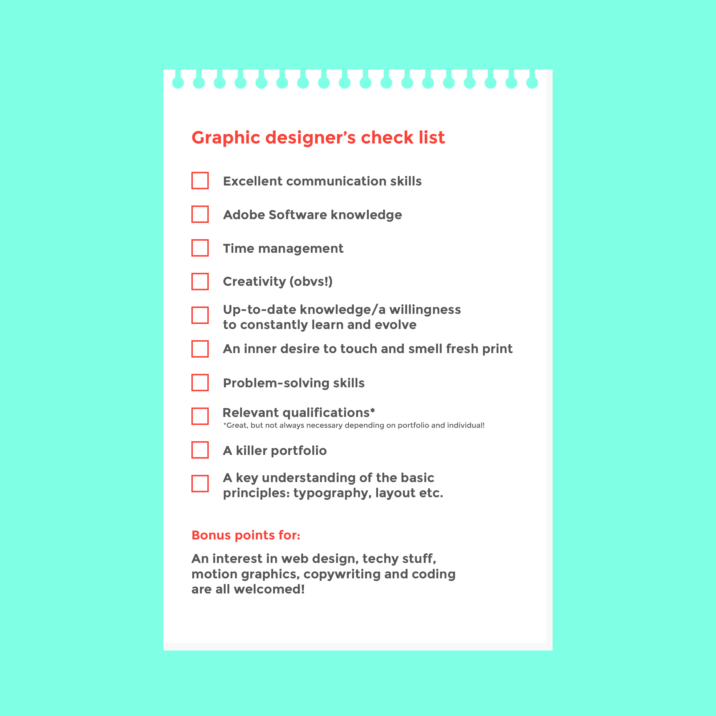 Knowledge of Adobe software - Adobe CC is the current industry standard of software for graphic designers. You’ll be expected to have good knowledge of InDesign, Illustrator, Photoshop and Acrobat. Anything else is an added bonus, such as After Effects.