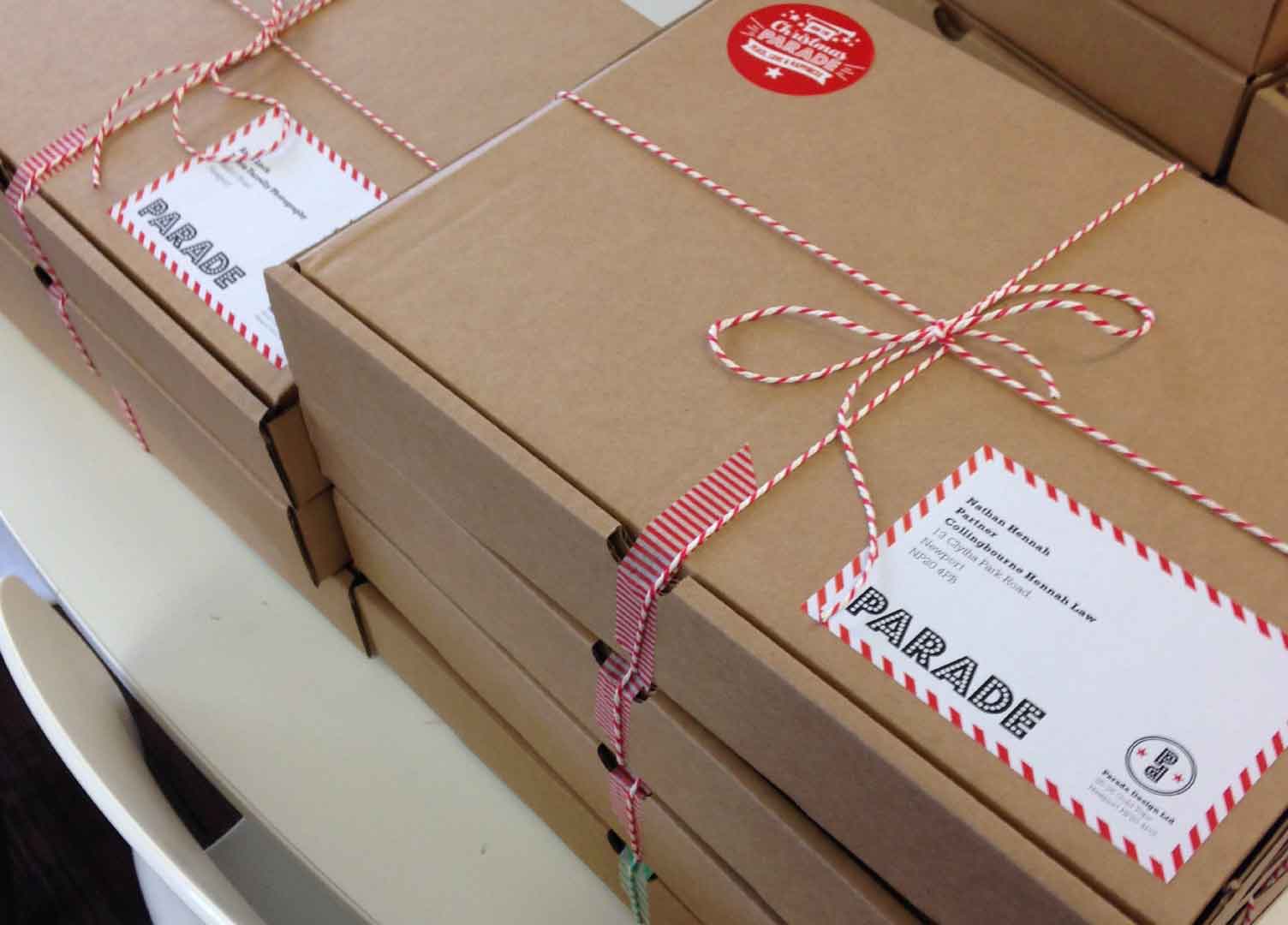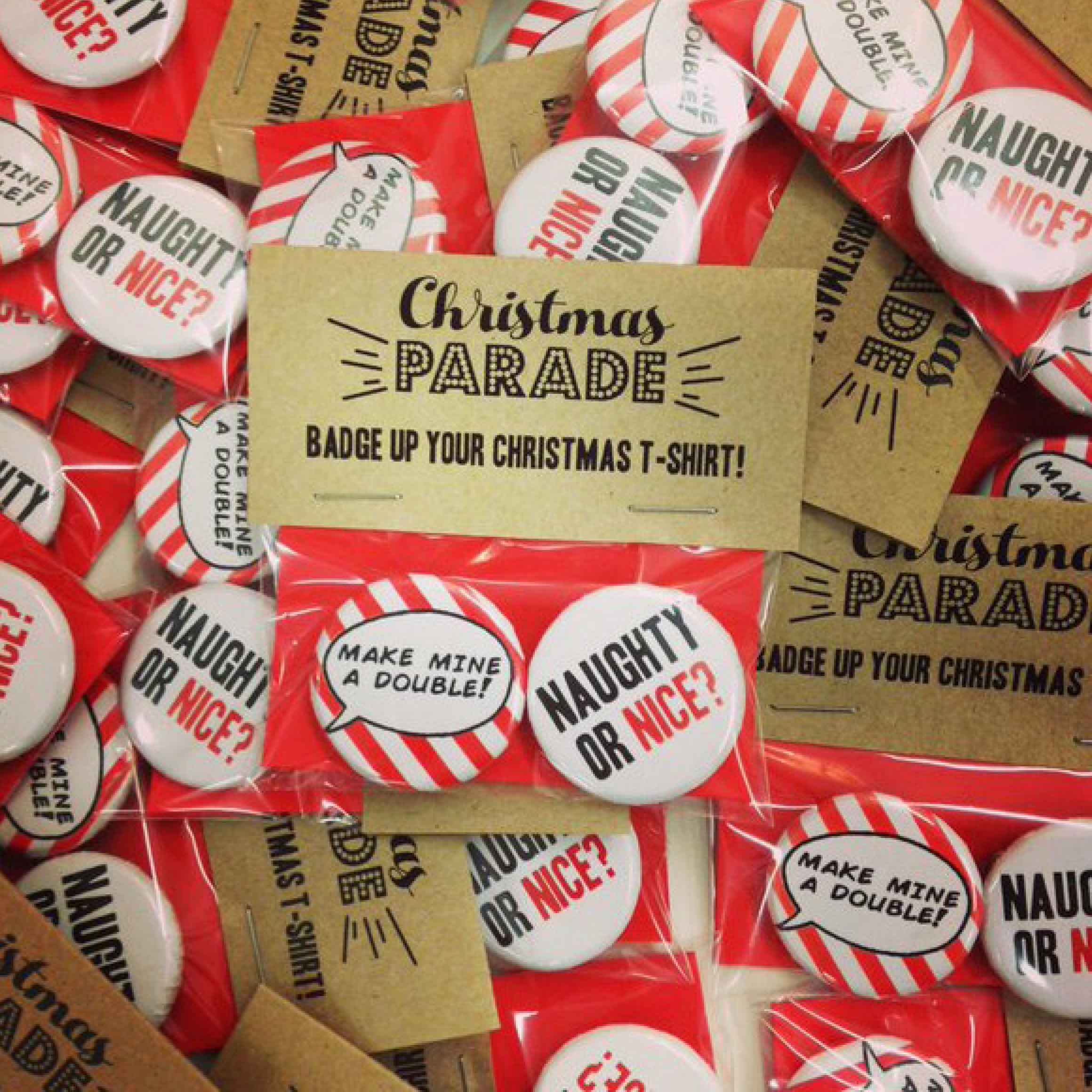 This year we designed a T-shirt to inspire the recipients to 'Join the Christmas Parade' and 'Prepare to Party'. Jolly red tees with gold screen-printed design were beautifully packaged (obviously) in candy-striped tissue, gold foiled tags and boxed up with twine. Included in the package were two button badges to add to the tees with the message 'Make Mine a Double' and 'Naughty or Nice?'
