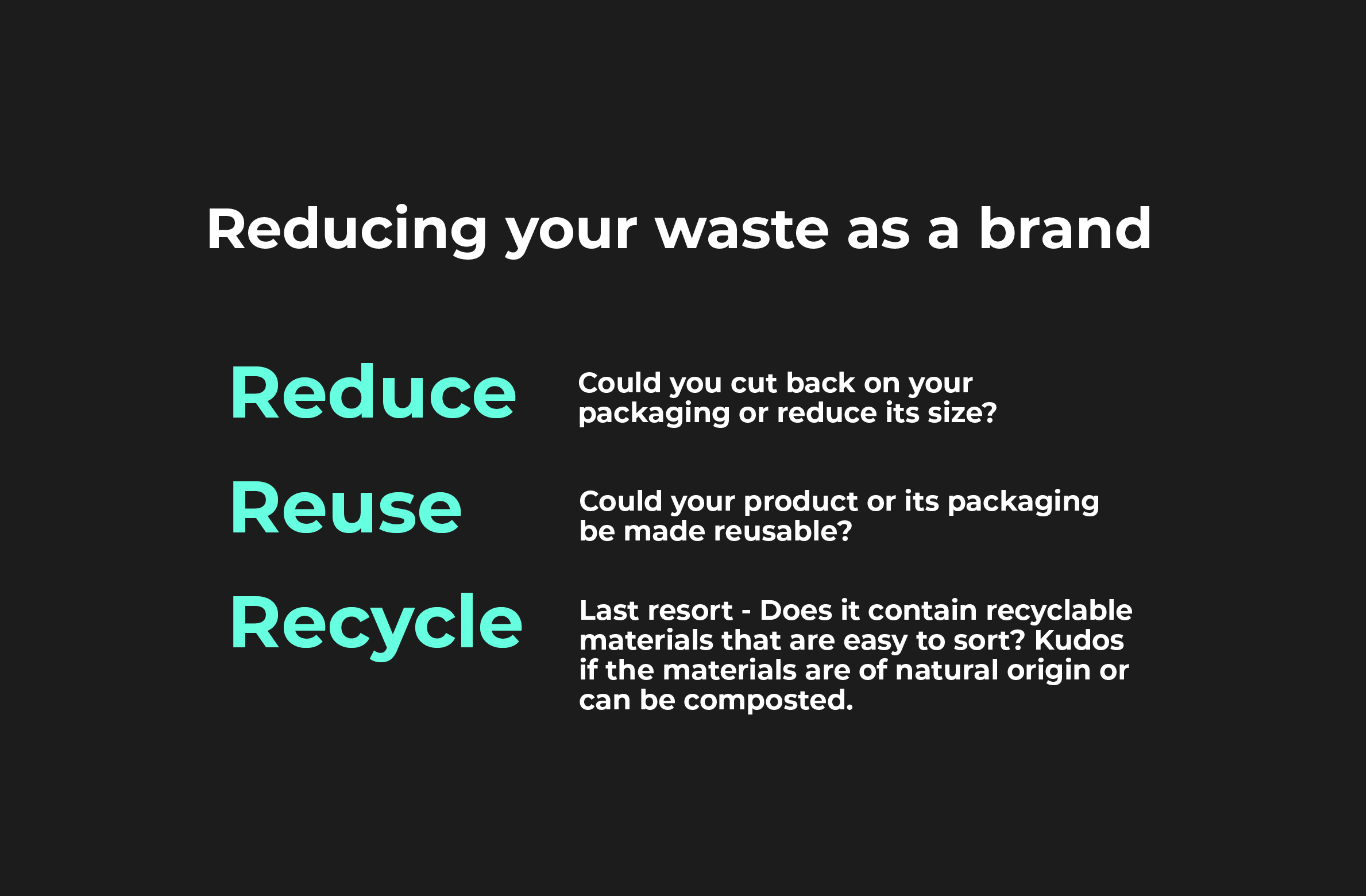 Plastics can take more than 400 years to degrade, so think about the lifespan of your product. Don’t get me wrong, plastic has its uses – it’s durable, but it’s also used for a lot of single use products. If you’re confident that your product is going to be around for 400 years, well done! But if it’s going to be used and then thrown away quickly, think about alternative materials, or cut back!
