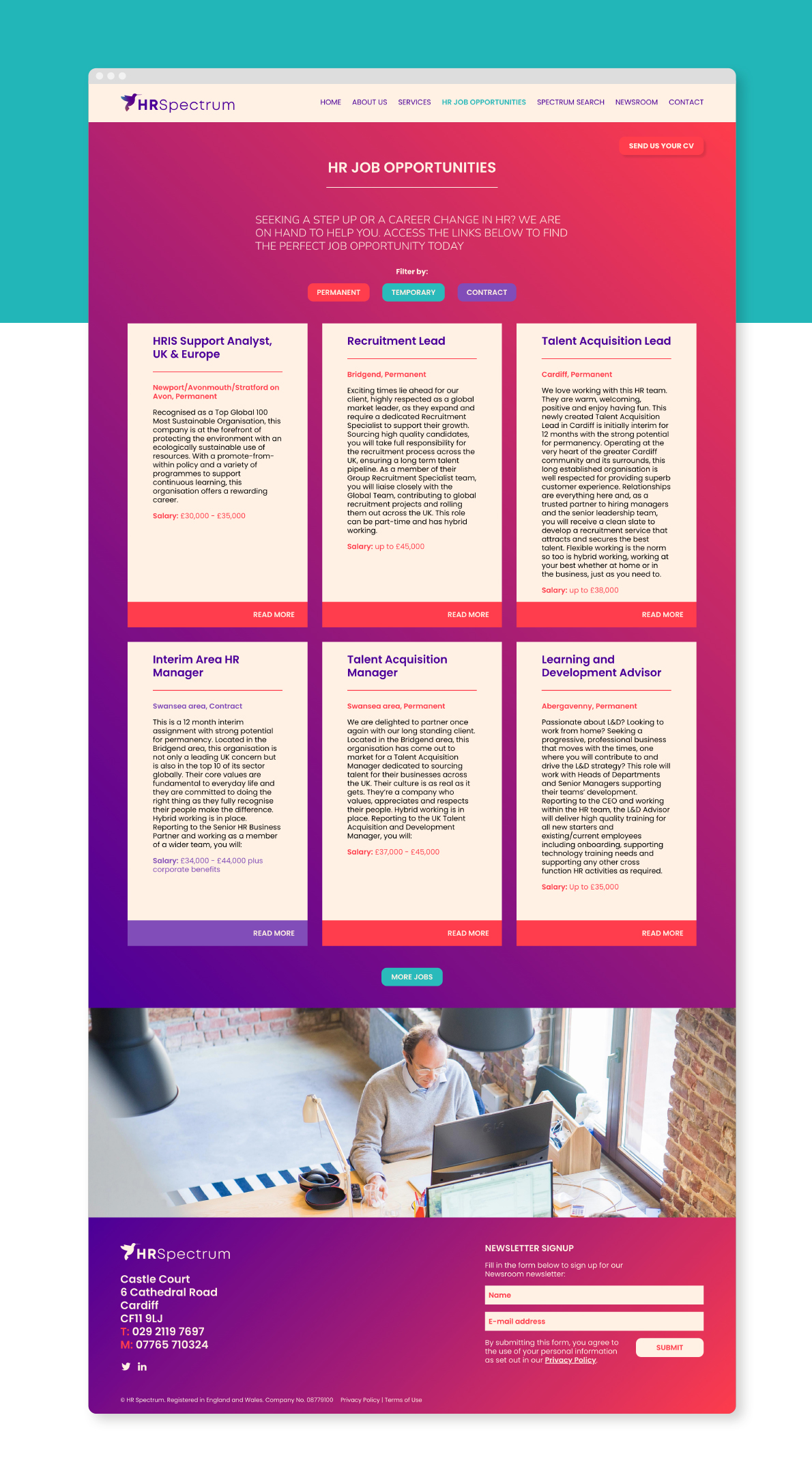 We designed and built a brand new website for HR Spectrum. The website not only had to be user-friendly for candidates but also for administrators who would be using the back-end of the CMS to upload jobs and update content. For candidates browsing for roles, a filtering system for permanent, temporary and contract jobs was integrated and a quick link panel to attach CVs and send with a click of a button.