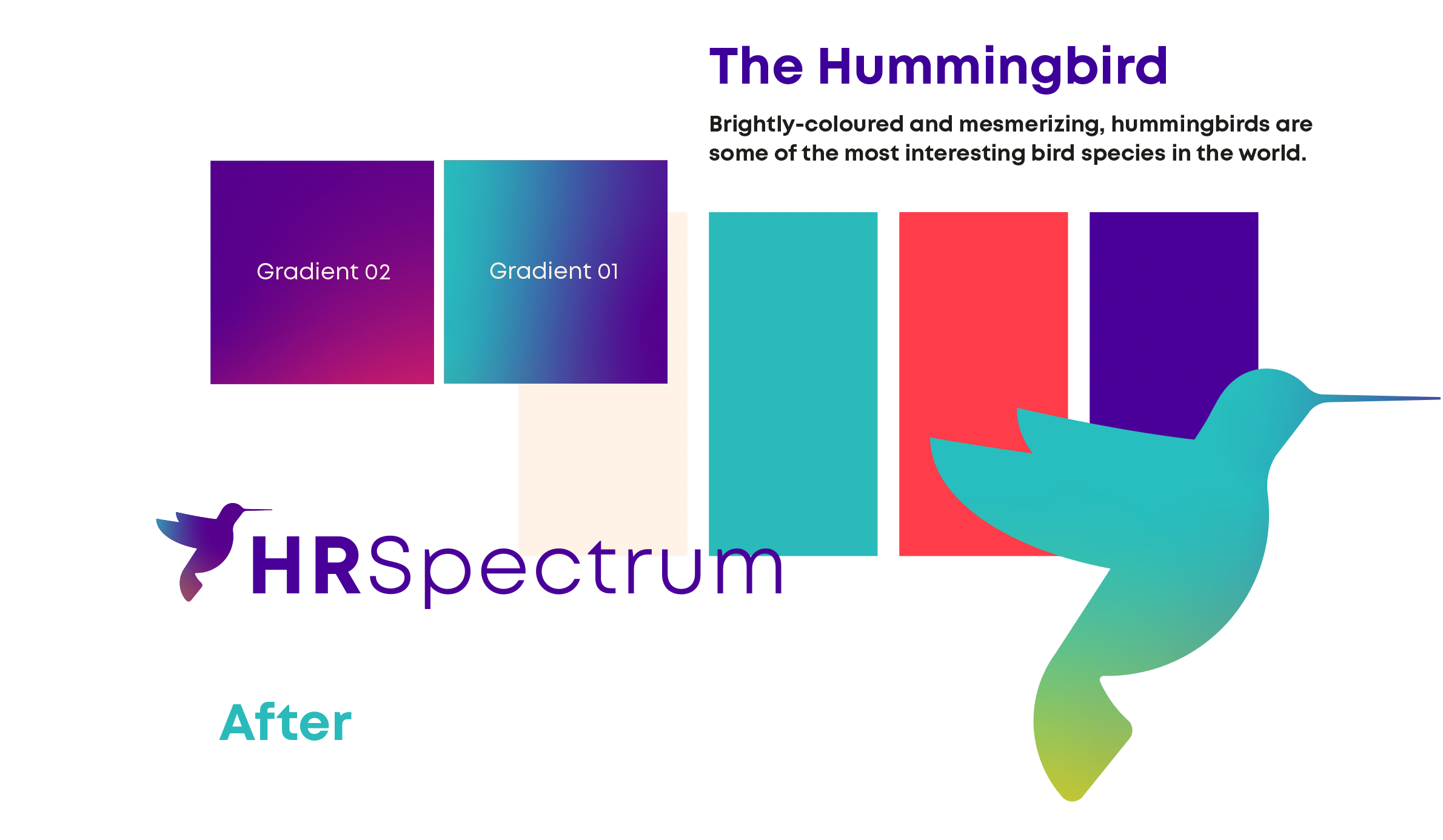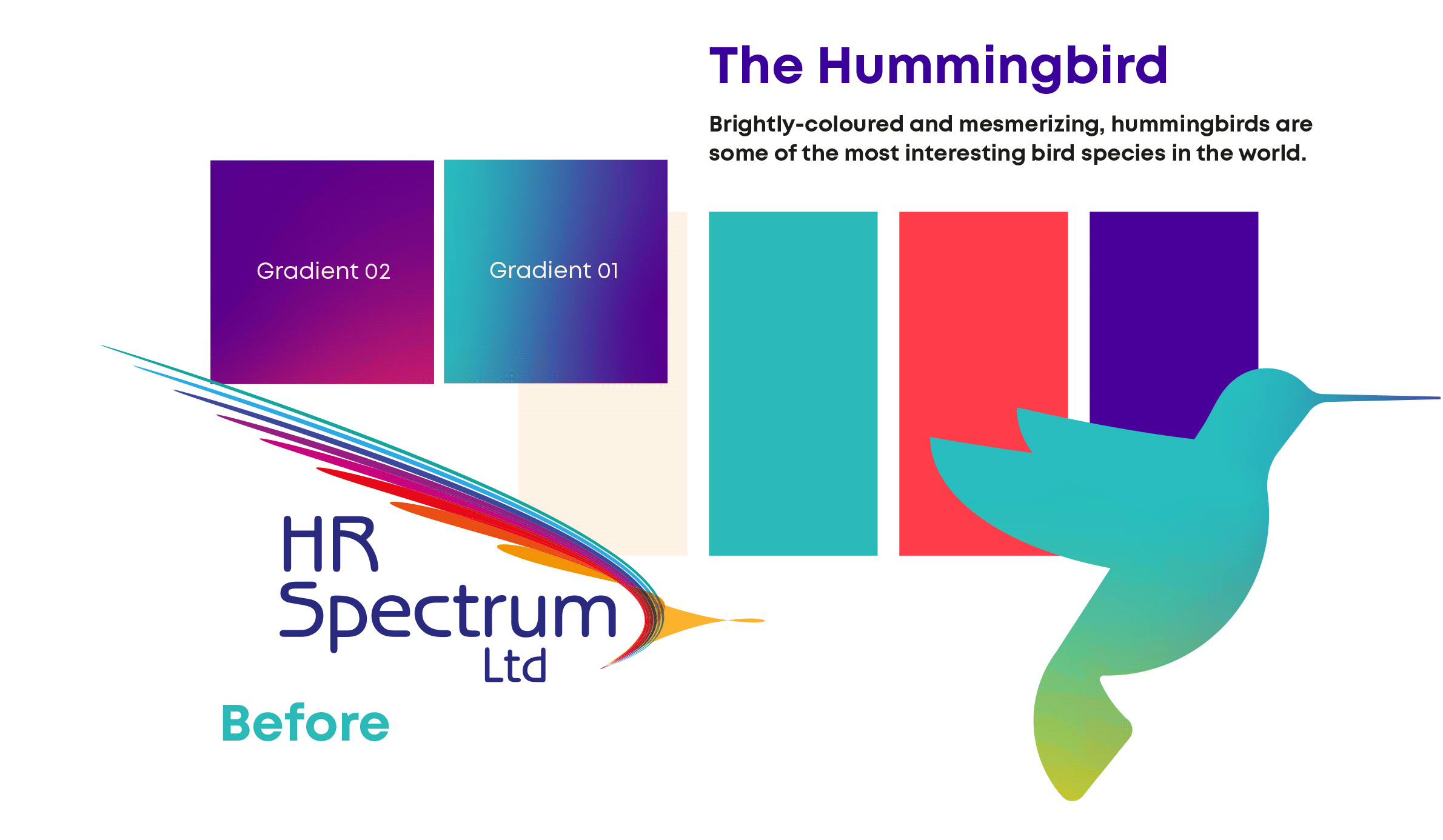 Rather than using the spectrum of colours in its original form, we created a gradient effect to use instead. We chose 2 main gradient colours best reflecting the hummingbirds feathers for static logos and layouts. On digital formats the gradients move to highlight the spectrum of colours synonymous with the brand name.