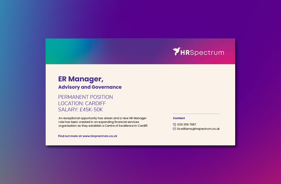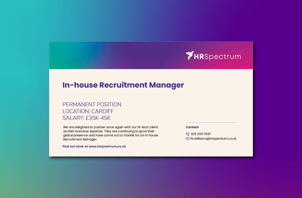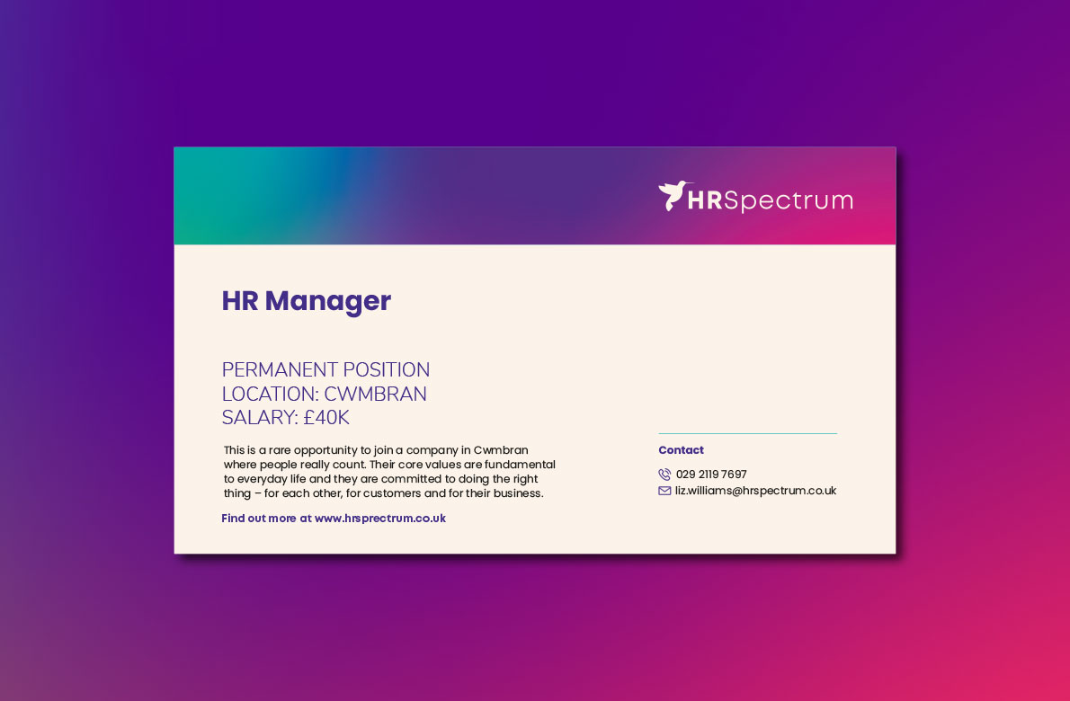Our task for this brief was to create a new logo and brand identity for HR Spectrum, an established HR and L&D recruitment business with over 25 years experience in the recruitment industry. HR Spectrum specialise in recruiting senior HR leaders, middle HR management and HR graduates across Wales.