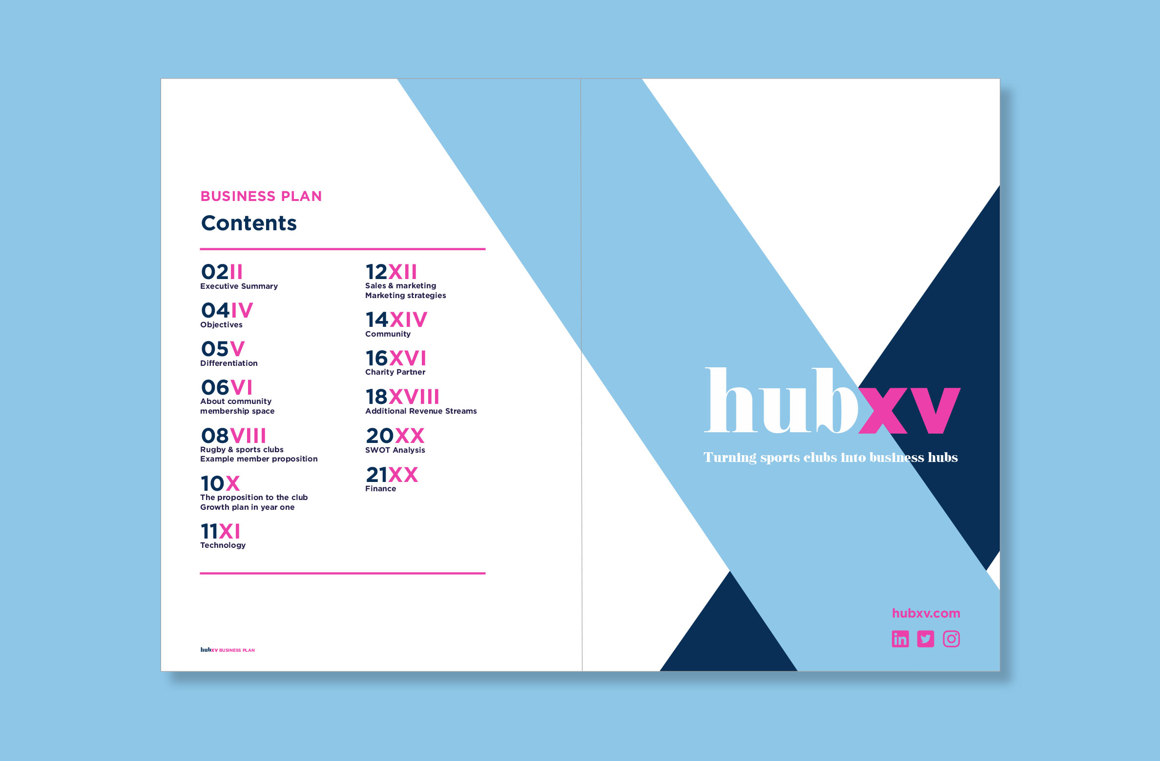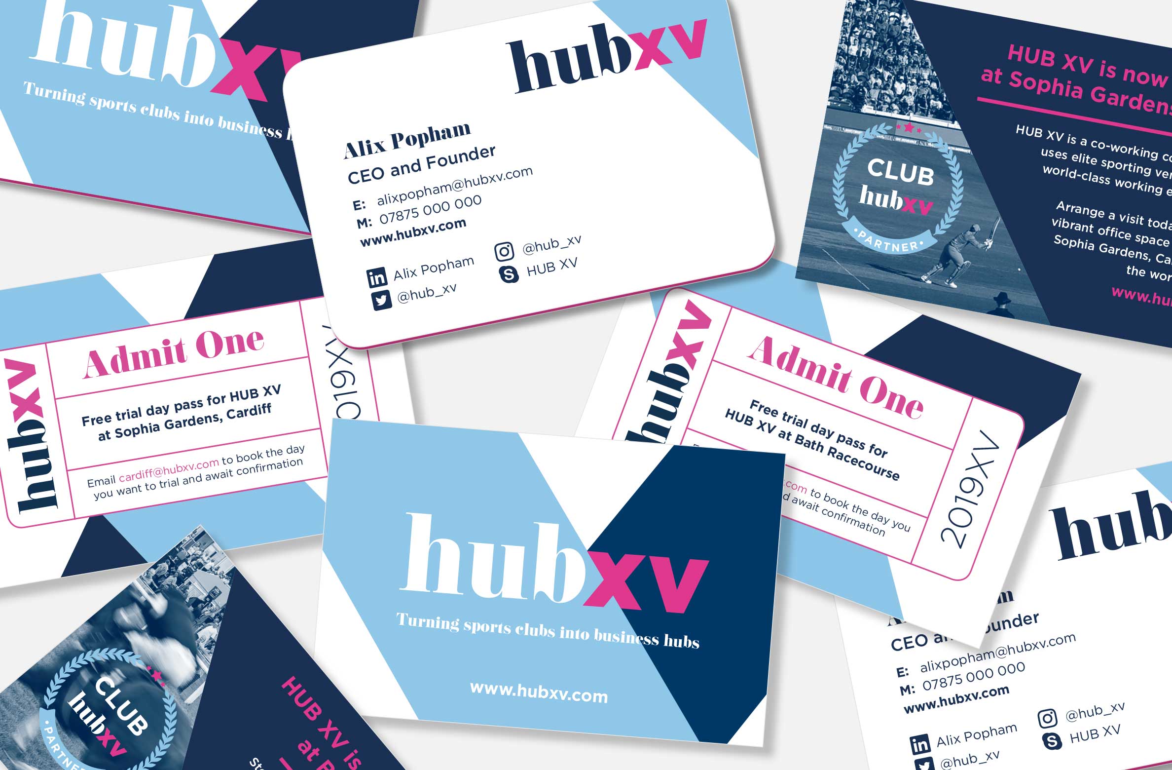 The objective for the brand was to develop an identity that represented the ethos of Hub XV. We paired an elegant serif typeface with a clean bold sans-serif typeface to form the logo. The cross over shapes we used throughout the brand not only replicated the X in XV but also signified the meeting of sport and business. We created bespoke emblems to use throughout the brand for partners, sponsors, members and events which were inspired by heritage sports iconography. The brand worked nicely over both printed and digital mediums with everything from signage to social media.